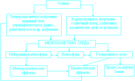 Земля непрерывно бомбардируется потоком частиц, летящих от Солнца, - так называемым солнечным ветром. Столкновение солнечного ветра с магнитным полем Земли приводит к возбуждению электрических полей и токов. Хвост магнитосферы Земли вытягивается в межпланетное пространство по крайней мере на тысячу радиусов Земли. В хвосте содержатся огромная энергия - 10 МДж. Часть этой энергии приходится на область, находящуюся вблизи Земли. С ней связано образование полярных сияний на высотах около 100 км. Когда магнитосферный хвост "переполняется" энергией, происходит ее высвобождение. Гигантский сгусток энергии в виде макрообразований ("плазмоидов") отрывается и со скоростью 500-1000 км/с покидает магнитосферу, уносясь в межпланетное пространство. При этом оставшаяся часть магнитосферы сокращается и частично замыкается через ионосферу Земли, вызывая возмущения ее магнитного поля. Различают явления, связанные с потерей магнитосферой накопленной энергии, и магнитные бури. Первые имеют длительный период накопления энергии и быструю ее отдачу (в течение часа). Магнитные бури, наоборот, имеют длительность более суток и определяются не столько периодическими процессами в магнитосфере, сколько возникновением ударных волн в солнечном ветре в результате вспышек на Солнце. Хотя физика причин различна, для биосферы Земли оказался важным сам факт изменения электромагнитных полей в атмосфере. Вблизи поверхности Земли влияние солнечного ветра ослаблено атмосферой, но тем не менее оно существует с периодом 4-7 суток с наложенными на него за счет вращения Земли вокруг своей оси дневными и ночными колебаниями. Механизмы воздействия электромагнитных полей на живые организмы и человека полностью пока не известны, но факт их воздействия установлен. Земля получает от Солнца не только свет и тепло, обеспечивающие необходимый уровень освещенности и среднюю температуру ее поверхности, но и подвергается комбинированному воздействию ультрофиолетового и рентгеновского излучения, солнечного ветра, солнечных космических лучей. (см. схема.)