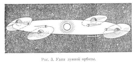 За время своего месячного оборота вокруг Земли Лупа дважды пересекает плоскость земной орбиты в точках, расположенных на линии узлов. Направление линии узлов, соответствующее точке, в которой Луна поднимается к северу от эклиптики, называется направлением восходящего узла; противоположное направление, где Лупа опускается к югу от эклиптики, называется направлением нисходящего узла. Так как Земля движется вокруг Солнца, плоскость лунной орбиты перемещается в пространстве параллельно самой себе. Поэтому и линия узлов, проходящая всегда через Землю, будет перемещаться в плоскости земной орбиты параллельно самой себе, й тогда, как это видно из рис. 3, линия узлов дважды в год будет обращена к Солнцу: один раз направлением восходящего узла, другой раз направлением нисходящего узла.