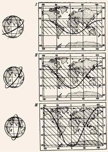 Наклонение орбиты ИСЗ является важным параметром, так как определяет широтный пояс поверхности Земли, который подлежит фотографированию. Трасса полета ИСЗ не может выйти за пределы этого широтного пояса, поэтому от наклонения и высотыорбиты зависит ширина фотографической полосы. Здесь устанавливается прямая зависимость: чем больше угол наклона орбиты и чем больше ее высота, тем шире снимаемая полоса земной поверхности (рис.2). Помимо круговых орбит, по которым обычно летают метеорологические спутники, ПКК и орбитальные станции, для постоянного наблюдения за глобальными процессами на Земле используются эллиптические орбиты с большой разницей высот в апогее и перигее. По отношению к Солнцу или Земле выделяют два вида орбит - геосинхронную и гелиосинхронную.