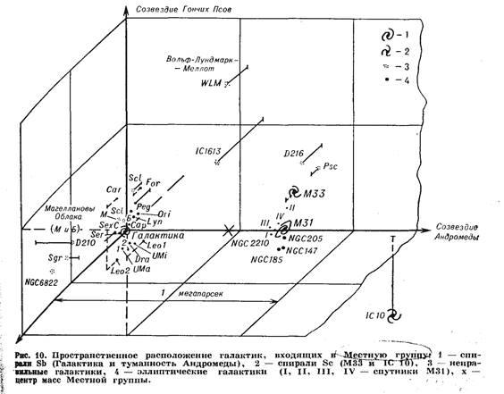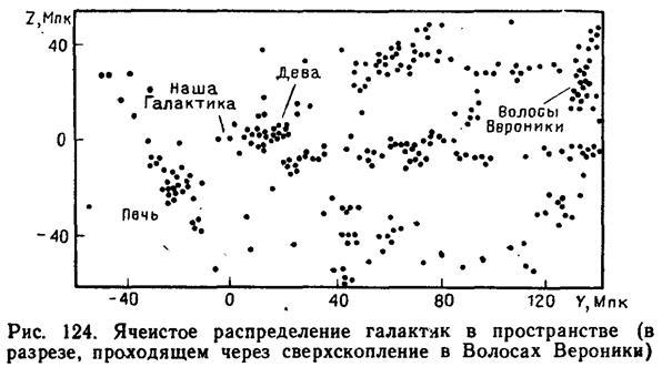 Соседние с местной группой галактик 10-13-й величины вращаются вокруг скопления в Деве. Общее число галактик нашего сверхскопления, исключая карликовые, - около 20 000. Его соседями являются сверхскопления во Льве (на расстоянии 140 Мпк) и в Геркулесе (190 Мпк). Всего выявлено пока около 50 сверхскоплений.