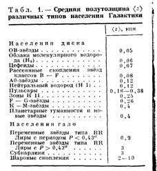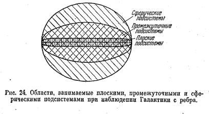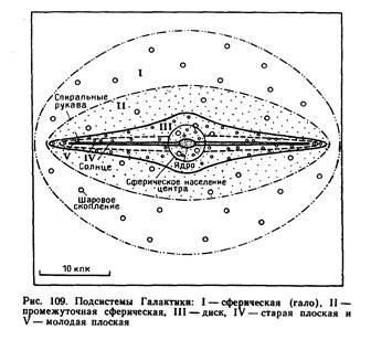 К населению диска относятся звёзды главной последовательности с нормальным содержанием тяжёлых элементов, звёзды-гиганты, белые карлики, планетарные туманности и др. Более молодое население диска выделяют в плоскую подсистему. Это ОВ-звёзды и их ассоциации, межзвёздные газ и пыль, сверхгиганты и цефеиды, зоны ионизированного водорода, пульсары, многие галактические источники гамма- и рентгеновского излучения. Населения гало включает шарообразные скопления (в которых есть источники рентгеновского излучения), субкарлики, переменные звёзды типа RR Лиры с дефицитом тяжёлых элементов. Гало отличается слабым вращением и большой дисперсией скоростей. Первоначальное (дозвёздное) вещество Нашей Галактики содержало по массе около 75% водорода и 25% гелия. Галактика сформировалась из медленно вращающегося водородно-гелиевого газового облака, начальные размеры которого в десятки раз превосходили современные размеры галактики. Характерное время стадии свободного сжатия под действием собственной гравитации, когда рождалось население гало, составляет »1 млрд. лет. В итоге сформировался тонкий газовый диск. Параллельно идёт обогащение межзвёздной среды тяжёлыми элементами. Звёзды диска образуются из вещества, участвовавшего в термоядерных реакциях в недрах звёзд и обогащённого тяжёлыми элементами, поэтому они богаче тяжёлыми элементами, чем образовавшиеся ранее звёзды гало. По той же причине молодое население диска содержит больше тяжёлых элементов, чем старое. Звёздообразование останавливается на несколько млрд. лет, чем можно объяснить разрыв между возрастами звёзд гало и диска. В плоской подсистеме Нашей Галактики находится большое количество газа и пыли (хорошо видимое раздвоение Млечного Пути в северной части неба), поглощающих свет многочисленных далёких звёзд.