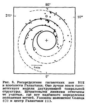 В окрестности Солнца существуют три области концентрации молодых объектов: в одной - Солнце (рукав Ориона). Вторая - ветвь Персея (на расстоянии около 1,5 кпк от Солнца). Третья - ветвь Стрельца (на расстоянии около 1.2 кпк). Рукав Ориона – это небольшое ответвление от спирального рукава. В Нашей Галактике центральная область скрыта от нас мощным слоем пыли, ослабляющим свет в десятки тысяч раз. В самом центре Нашей Галактики, в пределах 1 пк, находятся дискретные источники радио-, ИК- и рентгеновские излучения. В центре Галактики обычно выделяют три области. Первая область интересна особенностями кинематики и распределения газа. Вторая область включает в себя звёздный балдж и околоядерный газовый диск. Третья область – ядро с радиусом в несколько пк. Не исключено, что распределение веществ в центре галактики ассиметрично. У нашей Галактики может быть перемычка. Большой интерес представляет химический состав ядра Галактики. Звёздная плотность ядра высока. Температура зон в ядре Галактики выше, чем зон в спиральных рукавах (это говорит об отсутствие повышенного содержания тяжёлых элементов в ядре Галактики).