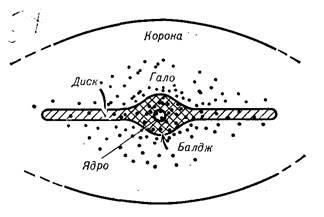 Кроме диска и гало есть ещё корона Галактики, природа населения которой не установлена. Отдельно рассматривают центральную область Галактики – балдж и находящееся в нём ядро. В ядре есть нейтральный водород, который растекается оттуда в плоскости Галактики со v»50 км/с. Создают излучение ядра оранжевые звёзды-гиганты. В центре ядра находится сгущение звёзд с малым, но компактным и сильным радиоисточником (Стрелец А). Возможно, что он является чёрной дырой (массой равной примерно миллиону солнечных масс).