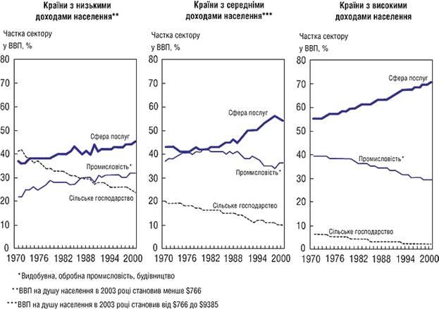Саме послуги, відповідно до досліджень міжнародної консалтингової компанії McKinsey, є джерелом довгострокового економічного зростання країн, що розвиваються, причому важливішим, ніж промисловість. Достатньо подивитися на динаміку розвитку названого сектору за останні 30 років — у розвинених країнах частка сфери послуг у ВВП зросла з 55% у 1970 році до 70% — на початку нинішнього тисячоліття (рис.1).
