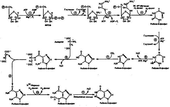 — образование 5-фосфорибозил-1-пирофосфата (ФРПФ). Эта реакция не уникальна для биосинтеза пуриновых нуклеотидов. ФРПФ служит также предшественником в синтезе пиримидиновых нуклеотидов (см. рис. 10), он необходим для синтеза NAD и NADP—двух коферментов, в состав которых входит никотиновая кислота. В реакции 2