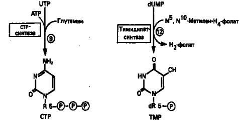 -метилентетрагидрофолата) до метильной с одновременным окислением тетрагидрофолата до дигидрофолата. Для того чтобы фолатный переносчик и далее мог функционировать, необходимо восстановить дигидрофолат до тетрагидрофолата. Эту реакцию катализирует дигидрофолатредуктаза. Именно поэтому делящиеся клетки, вынужденные синтезировать ТМР с образованием дигидрофолата, оказываются особенно чувствительны к ингибиторам дигидрофолатредуктазы. Один из таких ингибиторов — метотрексат (аметоптерин) широко используется как противоопухолевый препарат (см. ниже).