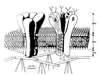Сборка многих субъединичных комплексов, содержащих разные субъединицы, тоже, по-видимому, происходит в эндоплазматическом ретикулуме. Примером служит никотиновый ацетилхолиновый рецептор, который содержит две α-субъединицы и по одной β-, γ- и δ-субъединице (рис.4).