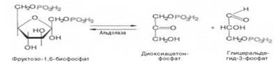Четвертую реакцию гликолиза катализирует фермент альдолаза. Под влиянием этого фермента происходит расщепление на две фосфотриозы: