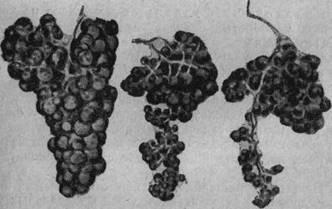 Рис. 3. Недостаток цинка у винограда. Справа—маленькие исковерканные ягоды и искривленные кисти; слева — нормальная кисть.