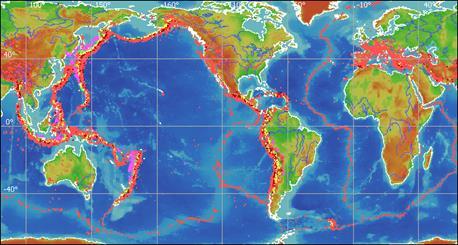 На приведенной здесь схеме показано распределение сейсмических толчков в глобальном масштабе.