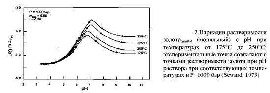 Первым фактором является рН раствора. Согласно уравнению, увеличение кислотности гидротерм будет вызывать отложение золота. В действительности этот вывод является очень упрощённым: в данных условиях золото может быть отложено также при увеличении рН (рис.1, 2,3). Важным моментом является то, что растворимость золота связана с рН, так как любой процесс, влияющий на рН, может потенциально вызвать отложение золота.