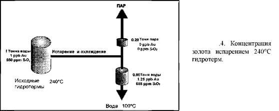 Испарение. Этот процесс более эффективен в качестве концентратора золота в растворе в небольшом масштабе, но не очень эффективен при образовании больших зон концентрированного отложения, поскольку энергетические затраты высокие. Выброс гидротерм при 240°С при падении давления до атмосферного (т.е. до 100°С) будет вызывать повышение концентрации лишь на 1/5 часть, которая приходится на уменьшение объёма гидротерм в виде пара, что слишком незначительно (рис.4). Более продолжительное испарение на поверхности в горячих котлах (прудах) может привести к образованию кремнистых золотосодержащих отложений (гейзерит), но обычно они не имеют промышленного значения. В связи с этим увеличение объёма рудосодержащих минералов может уменьшить содержание золота.