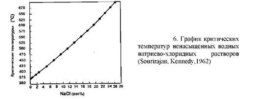 В порфировых около магматических средах вода может быть в условиях над критического режима, но отмечается, что критическая точка резко поднимается при повышении концентрации раствора (Рис.6). Таким образом, высокоминерализованные гидротермы, связанные с порфирами, могут находиться в до критическом режиме и подвергаться "кипению" с разделением на две разные фазы при температурах на многие сотни градусов, превышающие критическую температуру воды.