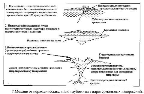 Большие промышленно значимые жилы образуются, если этот процесс регулярно повторяется. Он может быть вызван обоими механизмами. Повторные тектонические растяжения происходят регулярно, поскольку движения по разломам являются возобновляемым, периодическим процессом. Повторяющееся гидротермальное брекчирование может происходить в результате того, что гидротермальная система автоматически регулируется (рис.7).