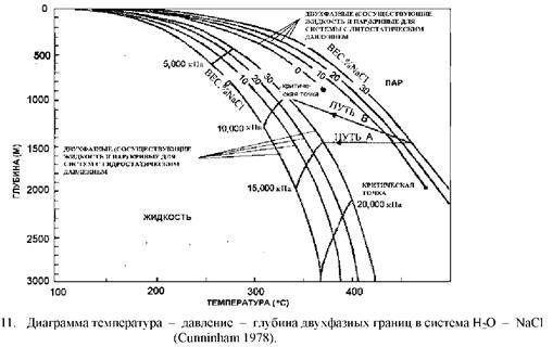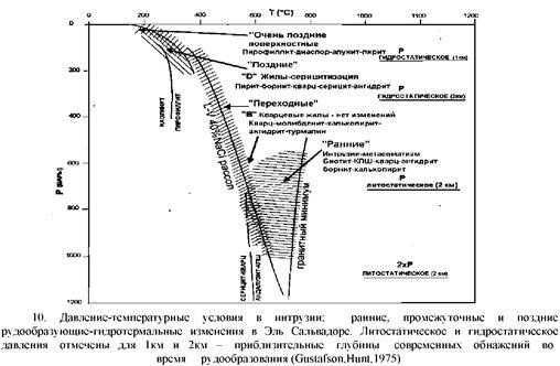 Важной характеристикой порфировых месторождений является эволюция состава гидротерм во времени. Первоначально гидротермы могут находиться при высоком давлении, равным или выше литостатического (рис.10,11).