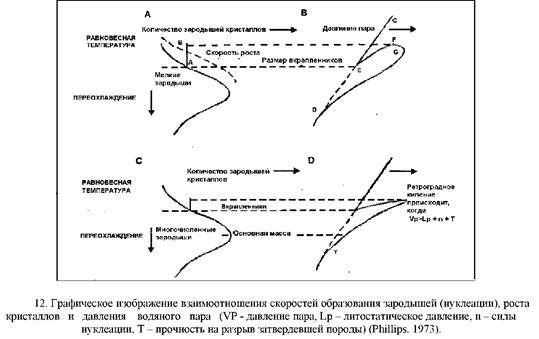 Магматические гидротермы выделяются (отделяются) от остывающей интрузии в виде явления (процесса) известного, как вторичное кипение (Phillips, 1973). Это происходит в результате пересыщения летучими компонентами, по мере того, как они концентрируются в остающемся расплаве при кристаллизации вкрапленников (рис.12). Самым важным продуктом кристаллизации расплавов является плагиоклаз, который образуется в ответ на понижение давления.