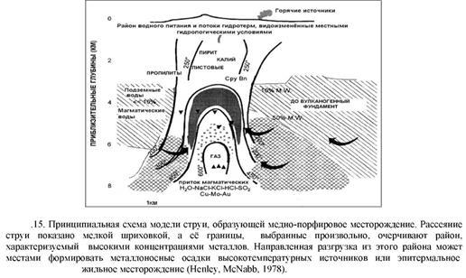 Образуется высоко минерализованный остаточный рассол, который стремится остаться вблизи интрузии, так как он тяжелый, тогда как отделившаяся менее минерализованная фаза более мобильна и стремится двигаться вверх и может эволюционировать в основную конвективную гидротермальную систему (рис.15). Отделение фазы является причиной образования двух разных типов флюидных включений, часто встречаемых в непосредственной близости порфировых месторождений. Их образование ранее объяснялось результатом деятельности двух различных по химическому составу, действующих последовательно один за другим гидротерм.