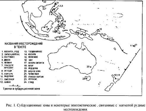Как уже ранее обсуждалось, большие богатые золотом гидротермальные месторождения порфирового и эпитермального типов встречаются в ассоциации с субдукционными зонами и зонами столкновения плит, гдг субдуционная зона погружается (рис.1). Предполагается, что это связано с химическим составом летучих компонентов в магмах, формируемые в этих условиях. Краткий обзор процессов генерации таких магм несомненно полезен.