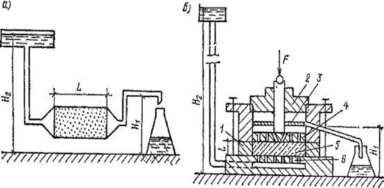 Для хорошо фильтрующих грунтов kf определяют с помощью прибора (рис. 5, а), состоящего из трубы длиной L, заполненной грунтом, и двух трубок — подводящей и отводящей воду. При разности напоров H2—Н1 вода будет фильтроваться под действием градиента i.