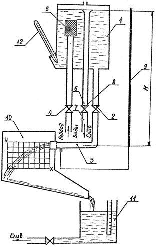 Для измерения координат точек вытекающей струи жидкости используется щит 9 из оргстекла с нанесенной на нем шкалой. Жидкость стекает в мерный бак 10, а из него в систему слива.