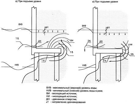 Рис.2.5 Схемы фильтрационного механизма разрушения грунтового основания при изменении уровня воды в реке