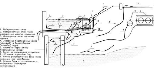 Рис. 2.6 Схема размыва грунта набережной на участке "опущеного" ростверка от поверхностного и подземного стока.
