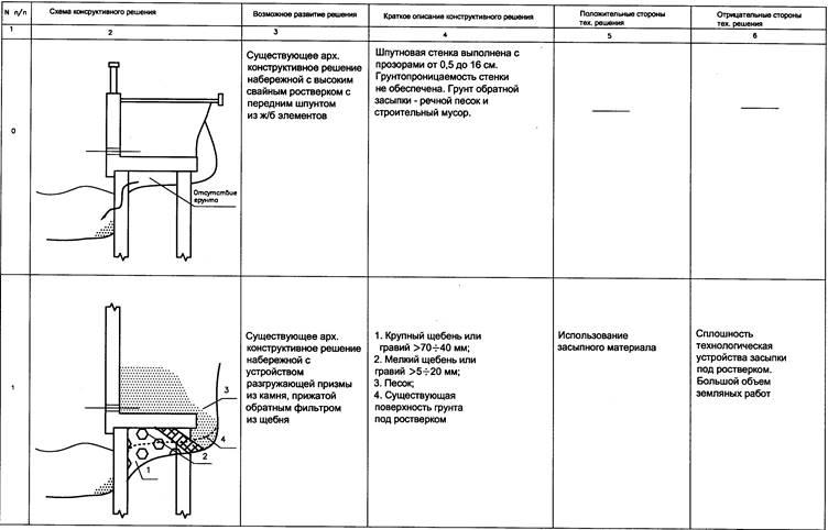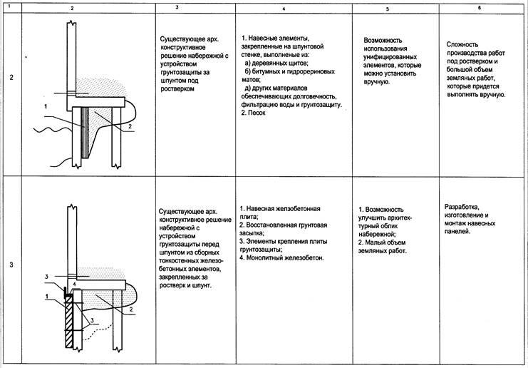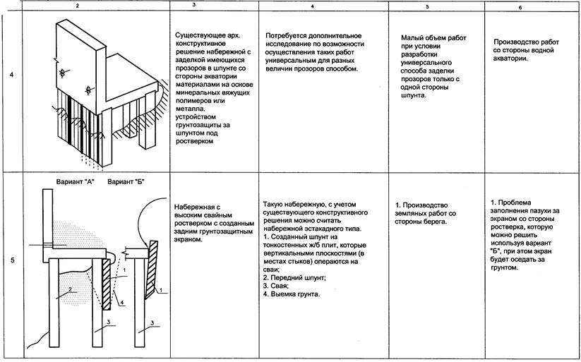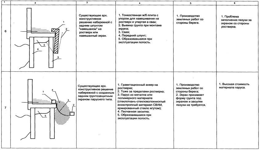В таблице 2.1 предложены 7 вариантов восстановления набережной р. Омь с устройством грунтозащиты за шпунтом под ростверком, грунтозащиты перед шпунтом из сборных ж/б элементов, заделкой прозоров в шпунте со стороны акватории вяжущими полимерами, устройством заднего грунтозащитного экрана, шпунтом, навешанным на ростверк и грунтозащитным экраном парусного типа (рис.1-7). На рис.0 таблицы 2.1 дано существующее конструктивное решение набережной с высоким ростверком.