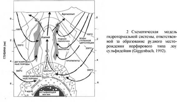 Эти системы также называются «адуляр-серицитовыми» системами (таблица 4.1), но это применимо лишь для узкого круга систем. В этих системах на больших глубинах, где реализуется порфировая рудная минерализация, источником гидротерм являются магматические дериваты (растворы) последней стадии плюс некоторое количество подземных вод. Giggenbach (1992) пришел к выводу, что системы такого типа образуются в тех случаях, когда интрузия находится на относительно большой глубине и/или в относительно непроницаемых вмещающих породах. Таким образом, магматические летучие подвергаются сильному охлаждению in-situ и взаимодействию вода-порода до того как они попадут в конвективный поток системы. Задержка летучих благоприятствует порфировому рудообразованию (рис..2), как, например, в случае месторождения Грасберг.