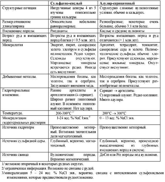 Таблица 1. Характерные черты месторождений адулярсерицитового и сульфатно-кислого типов