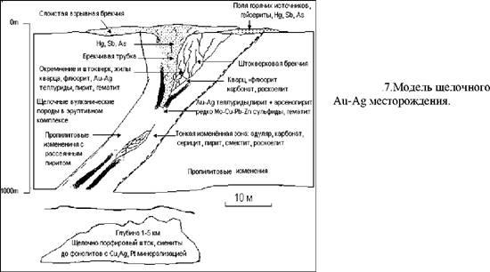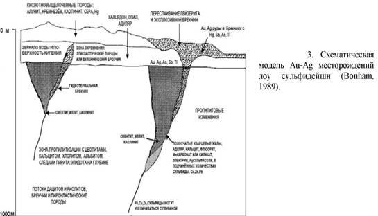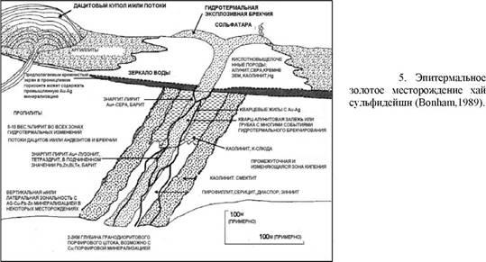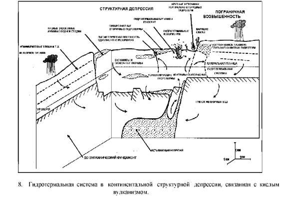 растворяется в грунтовых холодных водах. Промышленная рудная минерализация, в основном, связана с кипением гидротерм и в значительно меньшей степени со смешением. Поскольку эти месторождения образуются в структурных депрессиях, то они, по-видимому, могут быть погребены под вулканическими отложениями и полностью не эродированы.