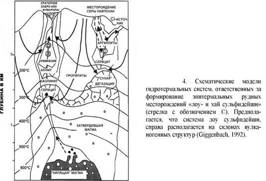 В этих системах химический состав иной, что способствует образованию, так называемых энаргит-золотьгх месторождений, или кварц-алунитовых, или алунит-каолинитовых месторождений. В этих системах внедрение малоглубинной интрузии приводило к сосредоточенному притоку значительного количества магматических летучих в верхние горизонты разрезов при повышенных температурах и почти без значительной нейтрализации при взаимодействии вода-порода или разбавлении подземными водами, как это характерно для «нормальных» гидротермальных систем (рис..4).