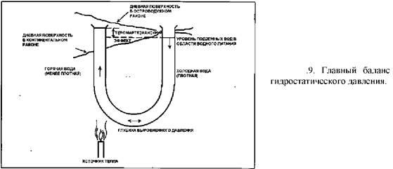 Питание метеорными водами гидротермальных систем происходит в районах, возвышающихся над поверхностью зоны восходящего потока. Простой баланс гидрогеологических напоров (давлений) показывает, что пьезометрический уровень высокотемпературных гидротерм в гидротермальной системе совпадает или немного выше дневной поверхности (рис..9).