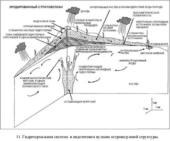 Магматические интрузии, нагревающие гидротермальную систему островодужного типа, в отличие от систем континентального типа, располагаются ближе к дневной поверхности. Следовательно, доля магматических летучих компонентов в этих системах обычная. Гидротермы минерализованы и, по-видимому, более кислые. Связи с подстилающими порфировыми месторождениями более тесные. На малых глубинах системы могут образовать эпитермальные месторождения хай сульфидейшн, но лишь в тех случаях, когда содержат дегазирующую гидротермально-магматическую систему, и в ней отсутствуют конвективные гидротермальные ячейки.