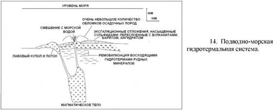 Месторождения массивных сульфидов, размещенные в вулканитах (VHMS), или месторождения типа Куроко, образуются в том случае, когда гидротермальная система разгружается на морское дно на большой глубине, и которая слишком значительна для формирования острова (рис..14). Эти месторождения будут описаны более детально в следующей главе. Здесь они упоминаются с целью продемонстрировать, как они сопрягаются с последовательным рядом, описанных выше, гидротермальных систем.