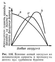 Осевая нагрузка на долото при бурении с повышенной частотой вращения обычно должна быть уменьшена на 20—25 % против величины, создаваемой при низкооборотном режиме в тех же случаях.