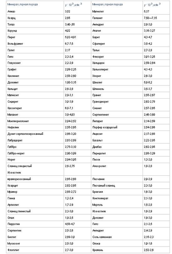 Таблица 4- Плотность наиболее распространенных минеральных и горных пород