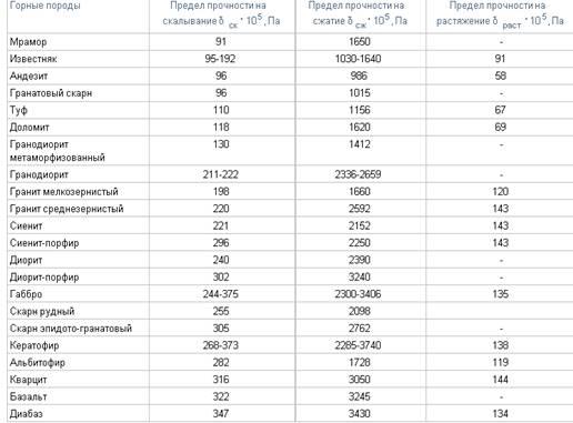 Таблица 5. Пределы прочности горных пород при сжатии, скалывании и растяжении