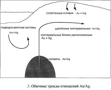 -Вариации отношения Au/Ag могут помочь в идентификации степени супергенного обогащения и, следовательно, промышленной значимости глубоких уровней месторождения. Если имеется очень высокое отношение Au/Ag, или если окажется, что оно уменьшается с глубиной, то может предполагаться супергенное обогащение. Если это так, то абсолютные содержания Au, наблюдаемые в поверхностных пробах или в неглубоких скважинах, могут на глубине не выдерживаться. Если, с другой стороны, имеется низкое отношение Au/Ag, то супергенное обогащение мало вероятно, и может быть большая уверенность сохранение концентраций на глубине.