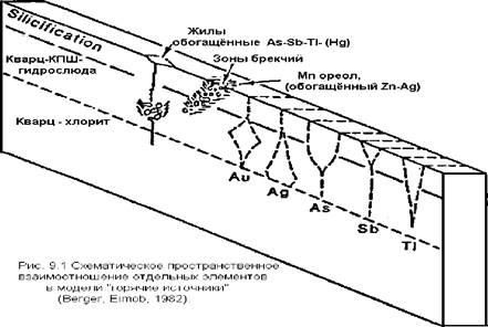 Рисунок 1 показывает схематическое взаимоотношение As, Sb и таллия с золотом и серебром в модели "горячие источники". Эта схема, в основном, идентифицировалась на основании работы в месторождении Маклевлин, для которого в свою очередь было установлено, что эта схема основана на нашем понимании активных систем, аналогичных Бродлэндс и Вайотапу в Н. Зеландии.