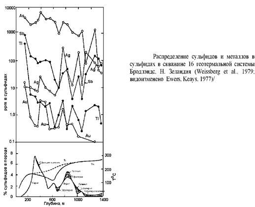 Рисунок 2 показывает распределение сульфидов и концентрации золота, серебра, мышьяка, сурьмы и таллия в сульфидах из скв. 16 в Бродлэндс. Общая картина распределения благородных металлов, лежащих на неблагородных в эпитермальных системах, здесь чётко прослеживается в Вайотапу мышьяк, сурьма и таллий также стремятся концентрироваться вблизи поверхности, как и ртуть. Ртуть и таллий обязаны своим повышенным содержанием около поверхности благодаря их летучести. Также следует ожидать, что они могут иметь латеральную зональность по мере удаления от высокотемпературных участков системы. Следует отметить быстрое увеличение в сторону поверхности таких металлов, как ртуть, сурьма, таллий и мышьяк; это аналогично тому, что отмечается в некоторых месторождениях. Очевидно, что уровень, несмотря на гидротермальные изменения и минералообразование, будет наиболее важным фактором в определении аномальных содержаний металлов у поверхности.