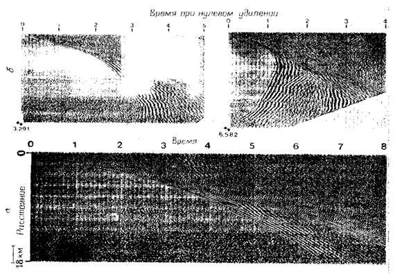 — разрез, редуцированный при скорости 5469 м/с с целью подчеркнуть оси синфазности высокоскоростных волн (вверху)