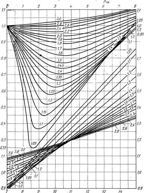 Затем находят приведенные псевдокритические давление и температуру при данных давлении Р и температуре Т.