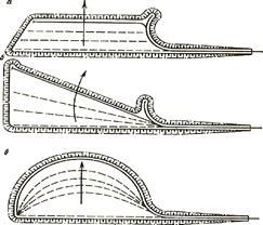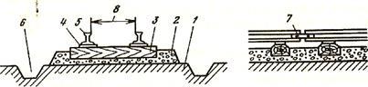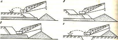 Процесс плужного отвалообразования включает выполнение следующих операций: разгрузку породы из думпкаров под откос отвального уступа, профилирование откоса уступа (вспашка), планировку поверхности отвала и передвижку пути (рис.7.6). Разгрузка думпкаров производится по всей длине отвального тупика. В зависимости от устойчивости откоса думпкары могут разгружаться по одному, группами и одновременно все. Часть разгружаемой породы скатывается по откосу, а большая часть (до 70 %) остается на откосе и препятствует разгрузке следующих составов. Для сбрасывания вниз оставшейся на откосе породы производится профилирование откоса отвала отвальным плугом. Разгрузка думпкаров и профилирование откоса отвала обычно производятся несколько раз. После заполнения отвального тупика тем же отвальным плугом производится планировка поверхности отвала. Планировка выполняется с таким расчетом, чтобы спланированная поверхность была выше старой трассы на 0,2-0,5 м для компенсации неизбежной просадки пути при движении локомотивосоставов. Профилирование откоса и планировка отвала выполняются плугом за несколько проходов вдоль отвального тупика. Рабочими органами отвального плуга являются выдвижные лемехи и крылья. Отвальные плуги выпускаются прицепные и самоходные (с вылетом крыльев до 7,5 м). Передвижка путей на плужных отвалах осуществляется путепередвигателями цикличного действия без разборки на звенья.