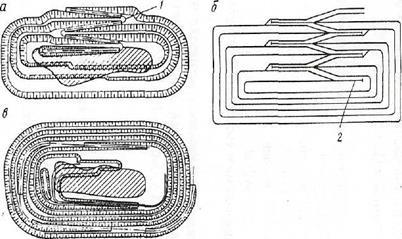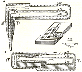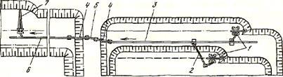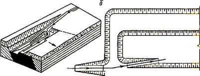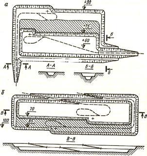 Ширина отвальной заходки (шаг переукладки путей) определяется производительностью бульдозера, объемом вскрыши, поступающим на отвал, полезной массой поезда, схемой путевого развития на отвале и затратами на передвижку отвальных путей. Экономически целесообразная ширина отвальной заходки изменяется в пределах 30-70 м. Рациональная длина отвального тупика находится в пределах 1,2-1,5 км. Различают торцовую, фронтальную и комбинированную схемы бульдозерного отвалообразования (рис. 7.7). При торцовой схеме складирование породы осуществляется диагональными проходами бульдозера. Достоинствами бульдозерного отвалообразования являются независимость шага переукладки путей от линейных параметров бульдозера, высокая приемная способность отвального тупика, небольшие капитальные и эксплуатационные затраты. Недостатки - зависимость производительности бульдозеров от климатических условий, расстояния транспортирования, типа складируемых пород, повышенный износ ходовой части бульдозеров и большой расход дорогостоящего топлива.