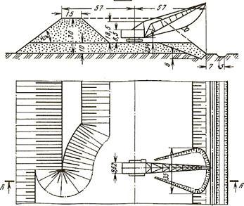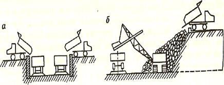 при использовании железнодорожного транспорта на отечественных карьерах является ведущим (на его долю приходится 85-90% объема складируемых пород). Работа отвальных экскаваторов состоит в экскавации породы, разгружаемой из думпкаров, и укладке ее в отвал. При использовании мехлопаты отвальный уступ разделяется на два подуступа. Мехлопата размещается на кровле нижнего подуступа. Для удобства приема и последующей экскавации разгружаемой породы из думпкаров экскаватор на кровле нижнего подуступа образует специальную приемную выемку (канаву) длиной равной полуторной или двойной длине думпкара, и глубиной 0,8-1 м. Локомотивосостав на отвал подается вагонами вперед. В приемную выемку, как правило, разгружаются думпкары поочередно. Укладка породы экскаватором в отвал производится в трех направлениях: вперед по ходу в нижний подуступ, в сторону развития отвала под откос нижнего подуступа и назад в верхний подуступ.