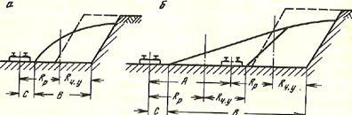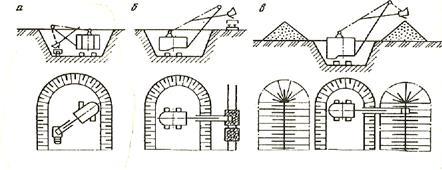 Рисунок 7.7 - технологические схемы бульдозерного отвалообразования при железнодорожном транспорте:а - торцовая; б - фронтальная; в - комбинированная