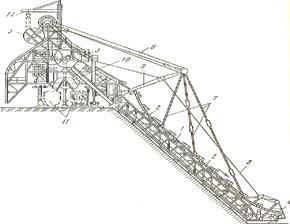 Процесс отвалообразования с помощью абзетцеров включает разгрузку думпкаров в приемную траншею, расположенную на поверхности отвала параллельно верхней бровке отвального уступа, черпание породы из траншеи, перемещение породы в отвал, планировку поверхности отвала и передвижку путей,
