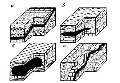 Геолого-промышленный район - часть угольного бассейна, характеризующаяся не только едиными геологическими условиями, но и общностью экономических, географических и исторических особенностей развития. Приведенные определения применимы с соответствующей поправкой к другим полезным ископаемым. Уголь в недрах залегает в виде пластов, руды - в виде жил, линз, гнезд, пластов, а горючие сланцы, соли, торф - в виде пластов и линз (рис. 1.1). Пласт - скопление в недрах полезного ископаемого, ограниченное двумя близкими к параллельным плоскостями и имеющее значительную площадь распространения по сравнению с мощностью (толщиной накопления). Группа пластов, залегающих совместно в порядке их генетического образования, чередующихся с вмещающими пустыми породами и объединяющихся по единому геологическому признаку (чаще всего - по возрасту), представляет собой свиту пластов. Вмещающие породы и свита угольных пластов вместе образуют угленосную толщу. Вмещающие породы, залегающие непосредственно выше пласта, называют кровлей, ниже пласта - почвой. Пластообразное скопление пустой однородной породы или часть пласта называют слоем.