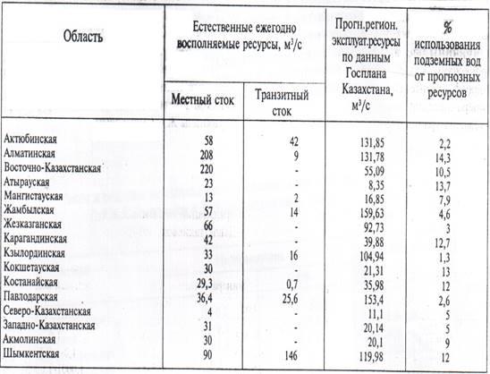 Распределение ресурсов подземных вод по административным областям Казахстана по состоянию на 1987 г.