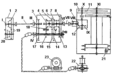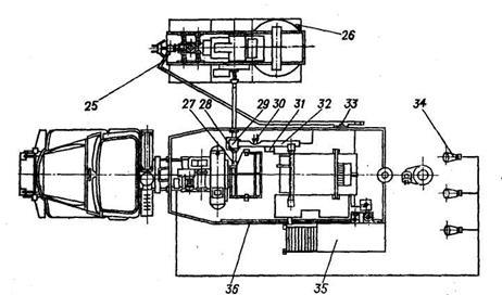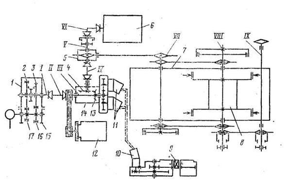 1 - стопор; 2 - ключ; 3 - створка; 4 — упор; 5 - ограничитель ключа и стопора; 6 - болт регулировочный; 7 — рукоятка подъема; 8 — гидроподъемник; 9 - амортизатор; 10 - серьга; 11 - винт; 12 - подвеска; 13 — гидрораскрепитель; 14 - ограничитель крутящего момента; 15 - рукоятка переключения скоростей; 16 – гидрорукав